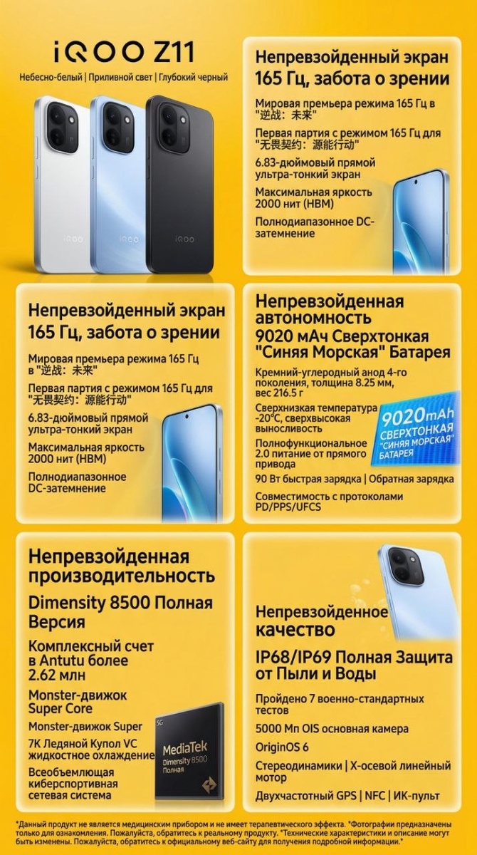 Характеристики: Процессор: MediaTek Dimensity 8500. Память: LPDDR5X + UFS 4.1. Экран: 6,83″ OLED, 2800×1260, 165 Гц, 5000 нит, ШИМ 2160 Гц. Камеры: фронтальная 16 Мп; задняя — 50 Мп (OIS) + 2 Мп (глубина). Аккумулятор: 9020 мА·ч, зарядка 90 Вт. Особенности: подэкранный сканер, X‑осевой вибромотор, стереодинамики, охлаждение 7000 мм². Связь: Wi‑Fi 6, Bluetooth 5.4, NFC, ИК‑порт, USB‑C. Защита: IP68/IP69. Габариты: 8,25 мм (толщина), 216,5 г. Цвета: Blue Wave Glow, Sky White, Midnight Black. ОС: OriginOS 6 (Android 16). 8 ГБ + 256 ГБ: 1 999 CNY (~26 000 руб.) 12 ГБ + 256 ГБ: 2 299 CNY (~30 000 руб.) 16 ГБ + 256 ГБ: 2 599 CNY (~34 000 руб.) 12 ГБ + 512 ГБ: 2 799 CNY (~36 500 руб.) 16 ГБ + 512 ГБ: 3 199 CNY (~42 000 руб.) 💬 Подпишись на ЧБ в МАКС
