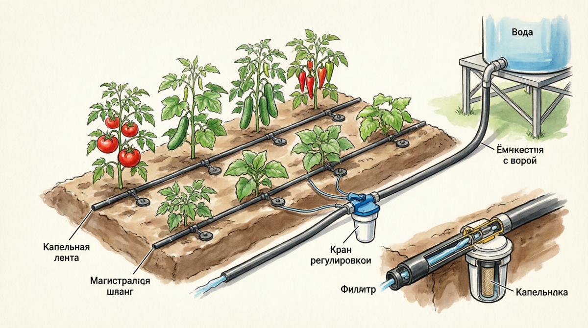 Помидоры трескались от неравномерного полива, огурцы желтели. Понял: без капельки современному огороднику не обойтись. Но когда посмотрел цены в магазинах, честно говоря, опешил. За готовую систему на мои восемь соток просили почти двадцатку. Решил делать сам — и не прогадал.