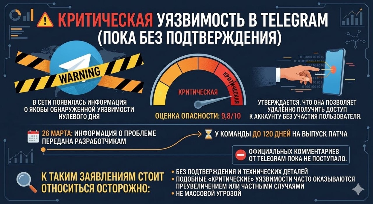 ) В сети появилась информация о якобы обнаруженной уязвимости нулевого дня в Telegram с оценкой 9,8/10. Утверждается, что она позволяет удалённо получить доступ к учетке без пользователя. По некоторым данным, о проблеме сообщили разработчикам 26 марта, и у команды есть до 120 дней на выпуск патча. При этом официальных комментариев от шефов Telegram еще не поступало. К таким громким заявлениям надо относиться очень осторожно: без подтверждения и технических деталей подобные «критические» уязвимости часто оказываются либо преувеличением, либо частными случаями, а не угрозой. Распространение материалов допускается только с указанием ссылки на источник. 🤩 PRO News: 2 года по любви! История компании продолжается...