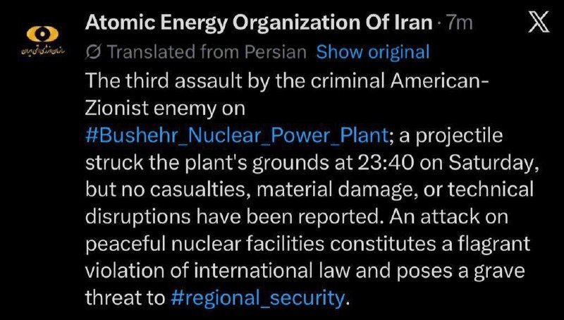 Несколько минут назад израильские и американские истребили нанесли удар по АЭС «Бушер» в Иране.