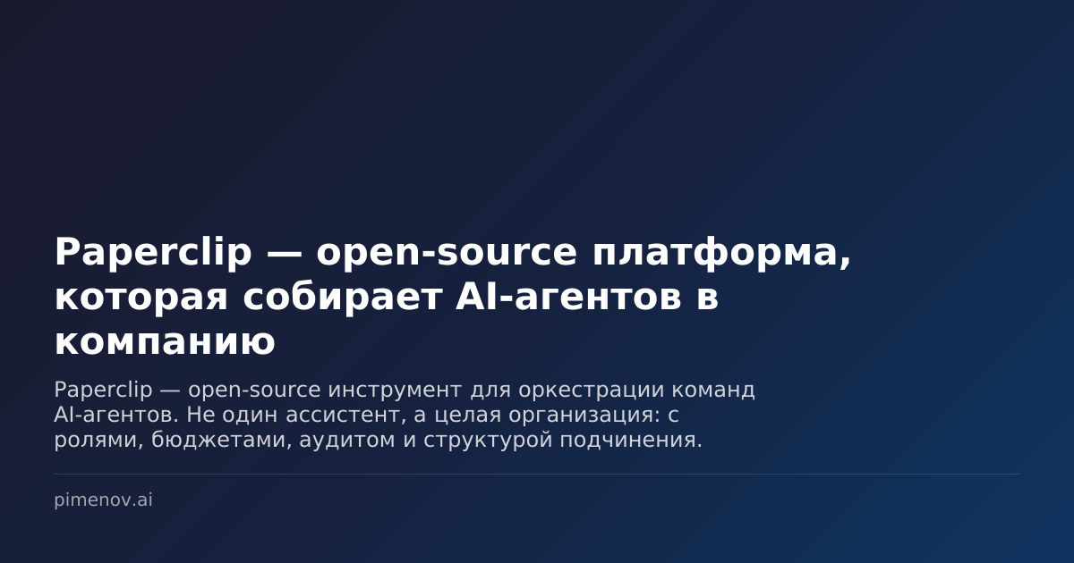 Paperclip — open-source инструмент для оркестрации команд AI-агентов. Не один ассистент, а целая организация: с ролями, бюджетами, аудитом и структурой подчинения. До сих пор разговор про AI-агентов крутился вокруг одного помощника: «дай задачу — получи результат». Один агент пишет код, другой отвечает на письма, третий анализирует данные. Каждый сам по себе. Но что, если вам нужна не горстка одиночек, а целая команда — с ролями, подчинением и общими целями? Именно это делает Paperclip — open-source платформа для оркестрации AI-агентов. Paperclip — это Node.js-сервер с React-интерфейсом, в котором вы собираете команду агентов и управляете ими как сотрудниками. CEO, инженер, QA, контент-стратег — каждый со своей ролью и зоной ответственности. Всё это работает через единый дашборд. Причём вы не привязаны к одному провайдеру: можно подключить Claude Code, Codex, OpenCode или любую модель через OpenRouter. Хотите — комбинируйте. Каждый раз, когда агент запускается, он начинает с чистого ли