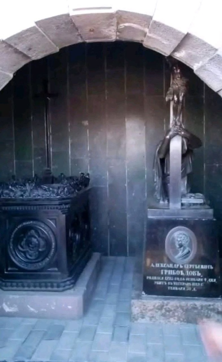 : "Согласно Ю.Тынянову, в Тегеране кяфира Грибоедова убили ударами сабли в грудь, а мальчишка, подмастерье кузнеца, кривым ножом ловко полоснул ему горло, встал ногой между лопаток, и шейные позвонки с хрустом отпустили голову с плеч. Затем Грибоедову выбили передние зубы, молоток вбил стекло пенсне в опустевшую глазницу, голову надели на шест и, потрясая им, двинулись по улицам. Важный кяфир, не встававший в присутствии шаха, был причиной войн, бедности, унижения общинных старцев и неурожая. Шутовская его голова плыла теперь над Тегераном и скалилась выбитыми зубами. Мальчишки швыряли в нее камни, и глупый стук раздавался при попадании. Здесь же в толпе несли руку Грибоедова с перстнем, и в его треуголке шел подмастерье кузнеца. Тело поэта и дипломата, привязанное вместе со стаей дохлых кошек и собак к шесту, тащили вслед за головой. Три дня с утра до вечера волочили почернелое ссохшееся тело русского посланника по столице. На четвертый день его бросили в выгребную яму. Голову выкину