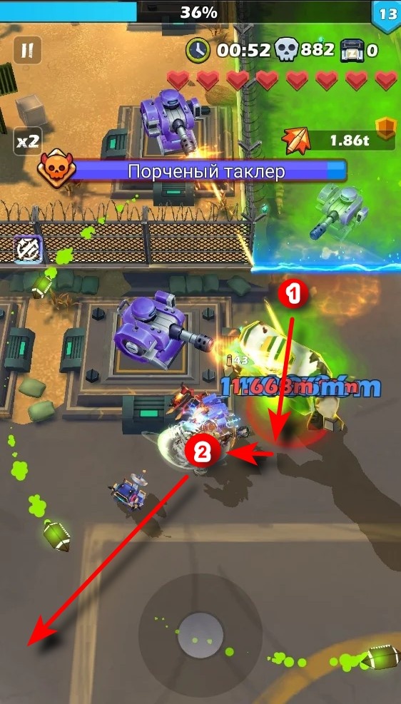 Задание гильдии за выполнение которого можно получить много сундуков обороны. Количество сундуков зависит от ранга Таклера, до которого доходит ваша гильдия. А способность гильдии дойти до высокого ранга зависит от количества и прокачки героев, от умения играть и от активности всей гильдии. Как играть правильно, как больше наносить урона Таклеру, я не знаю! Но как то само собою сложилась тактика, которую я постоянно применяю, и которая даёт неплохой результат. Вот этой своей тактикой я бы и хотел с вами поделиться! Если у вас есть более эффективный способ нанесения максимального урона в обороне, напишите в комментарии. Я обязательно изучу и покажу и ваш способ тоже! А сам играю вот так: Иду перед Таклером по коридору, буквально у него под ногами. Перед закрытием ворот выскакиваю и встаю в позицию №1: Как только Таклер разбивает ворота и выпускает круговые снаряды, перемещаюсь в позицию №2, ставлю перса за углом орудийной платформы. Псих подходит к углу и там зацепляется! То есть прим