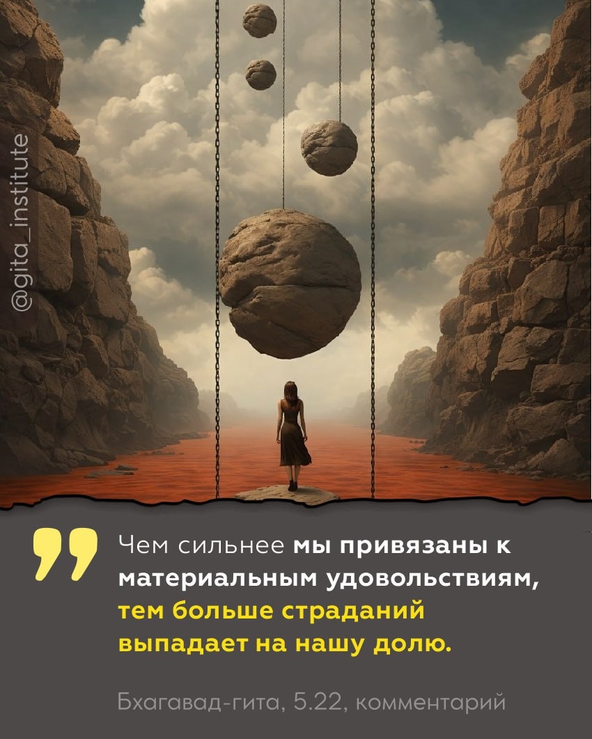 являются источником страданий. У всех материальных удовольствий, о сын Кунти, есть начало и конец, поэтому мудрец никогда не тешится ими. ©Бхагавад-гита 5.22 Комментарий Шрилы Прабхупады: Материальные удовольствия возникают от соприкосновения материальных чувств с объектами восприятия. Такие удовольствия преходящи, потому что само материальное тело бренно. Освобожденную душу не интересует ничто преходящее. Да и может ли тот, кто изведал высшее, духовное блаженство, довольствоваться иллюзорными радостями? В «Падма-пуране» сказано: «Для йогов Абсолютная Истина является источником безграничного духовного блаженства. Поэтому Высшую Абсолютную Истину, Личность Бога, называют Рамой». В «Шримад-Бхагаватам» (5.5.1) по этому поводу сказано следующее: «Дорогие сыновья, живому существу, получившему тело человека, нет смысла трудиться не покладая рук ради чувственных удовольствий, ибо такие удовольствия доступны даже пожирателям испражнений [свиньям]. Вы должны посвятить жизнь аскезе, чтобы о