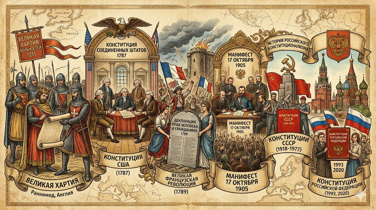 Конституция – наш личный контракт с реальностью. По ней мы судимся, женимся и платим налоги. Некое «пользовательское соглашение» человека с государством, которое подписывали не ручкой, а ссылками в Сибирь и прогулками на гильотину. По факту, старинная сага о том, как народ пытался надеть на власть смирительную рубашку и ограничить её в экспериментах со своей свободой и национальным бюджетом.
