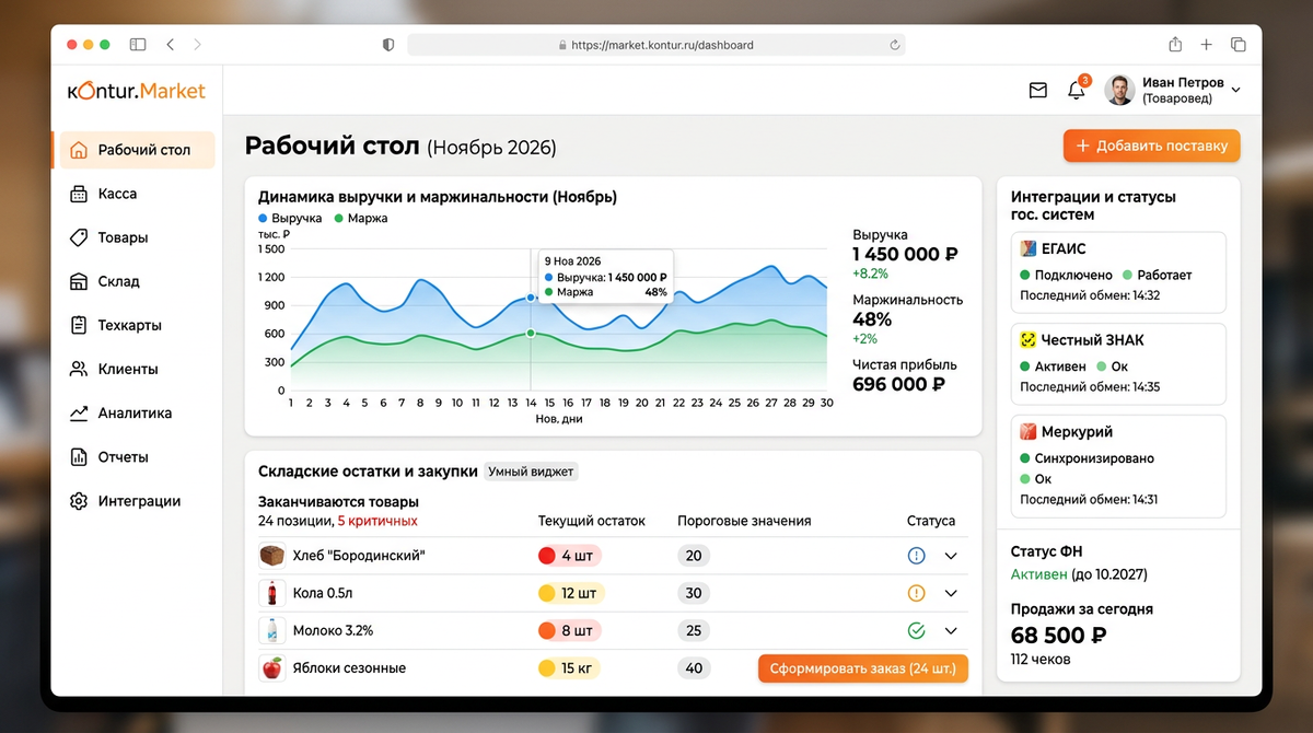 Контур.Маркет позволяет вести детальный учет товаров от момента их поступления до продажи. Система поддерживает электронный документооборот (ЭДО), что позволяет принимать накладные от поставщиков в пару кликов. В 2026 году внедрены алгоритмы предиктивного анализа: система сама рассчитывает, когда у вас закончится молоко или чековая лента, и предлагает сформировать заказ поставщику на основе динамики прошлых продаж.