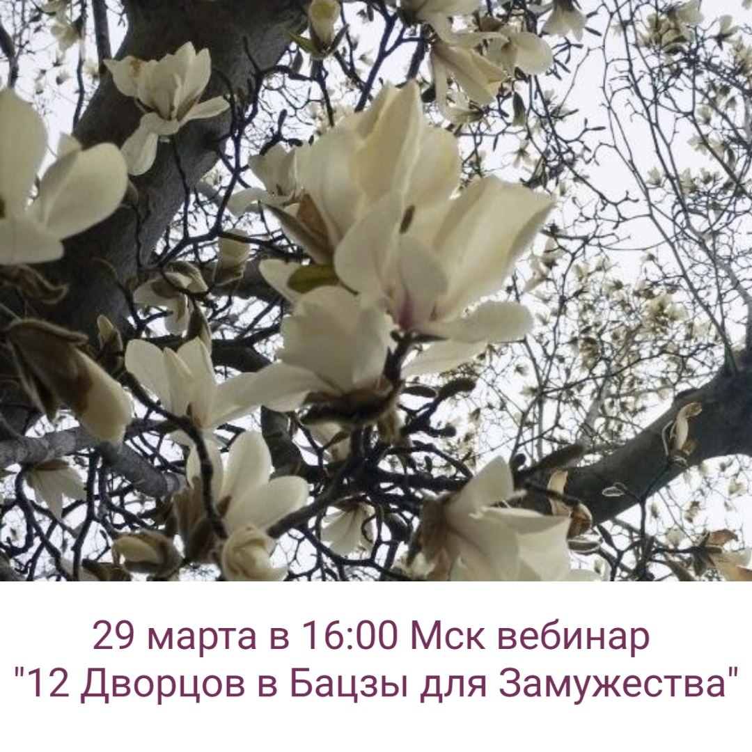 ! 29 марта в 16:00 Мск приглашаю вас на бесплатный вебинар на тему "12 Дворцов в Бацзы для Замужества" Мы обсудим следующие вопросы: Сильный или слабый муж. Почему все хотят сильного? Всегда ли это хорошо? Система 12 Дворцов в Бацзы - какую дополнительную информацию содержит? Как повлияет штамп в паспорте на вашу удачу? Места. в которых вы можете встретить будущего мужа - уже записаны в ваших Бацзы, в системе 12 Дворцов. Приходите, будет интересно! Вход на вебинар по ссылке https://start.bizon365.ru/room/18812/jv7qjbbuk