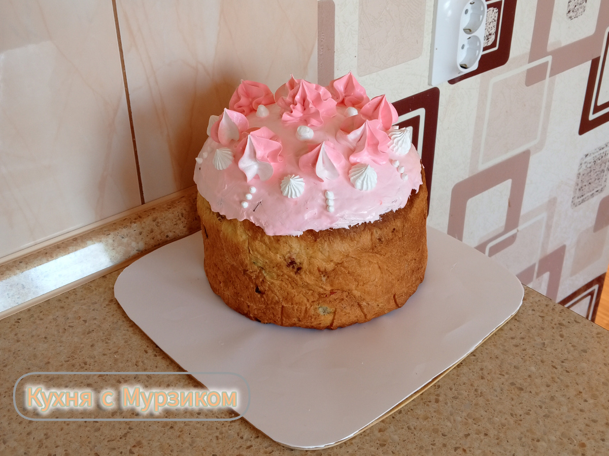 Я нанесла её на куличи, кондитерским мешком и насадки сделала цветочки, использовала каплю красного красителя, дала застыть при комнатной температуре.