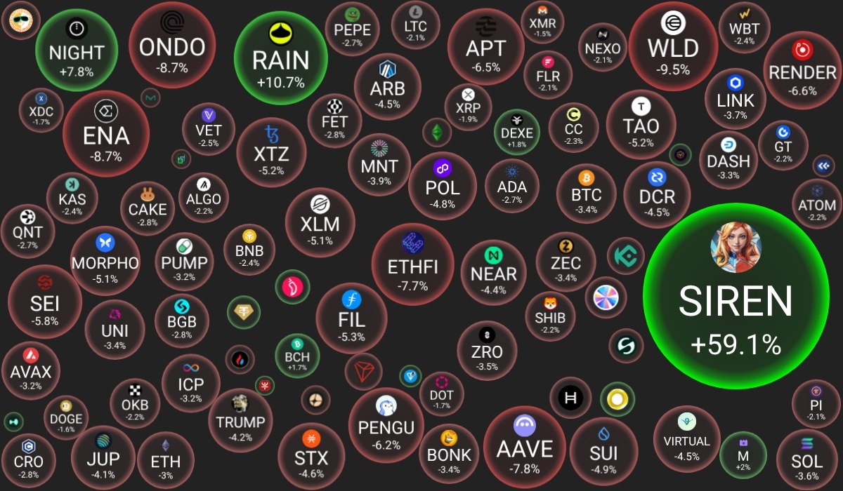 🗓 28.03.2026 09:30 по Москве. 🔗 Посмотреть на сайте 📈 Лидеры роста (из ТОП-100): 🟢 Siren (SIREN): $1.6530 (+59.1%) 🟢 Rain (RAIN): $0.0081 (+10.7%) 🟢 Midnight (NIGHT): $0.0480 (+7.8%) 📉 Лидеры падения (из ТОП-100): 🔴 Worldcoin (WLD): $0.2553 (-9.5%) 🔴 Ondo (ONDO): $0.2643 (-8.7%) 🔴 Ethena (ENA): $0.0899 (-8.7%) 🔍 Основные метрики: 🔴 Общая капитализация: $2294.34 млрд (-2.75%) 🟢 Общий объем торгов: $96.40 млрд (+6.38%) 🔴 Доминация Bitcoin: 57.91% (-0.40%) 🔴 Доминация Ethereum: 10.53% (-0.04%) 🔴 Индекс страха и жадности: 12 / 100: ЭКСТРЕМАЛЬНЫЙ СТРАХ (-1) 🔴 Индекс Альтсезона: 46 / 100: НЕ АЛЬТКОИН-СЕЗОН (-3) 📖 Интересно почитать: 👉 Абстракция сети в Web3: Единый интерфейс для всех блокчейнов — будущее криптовалют. 😻 Наши сервисы и бонусы: 💰 Cryptoage.com - рассказываем про Блокчейн и Криптовалюты с 2013 года 📈 Hyperliquid - крупнейшая DEX биржа, занимает 80% объема рынка DEX фьючерсов