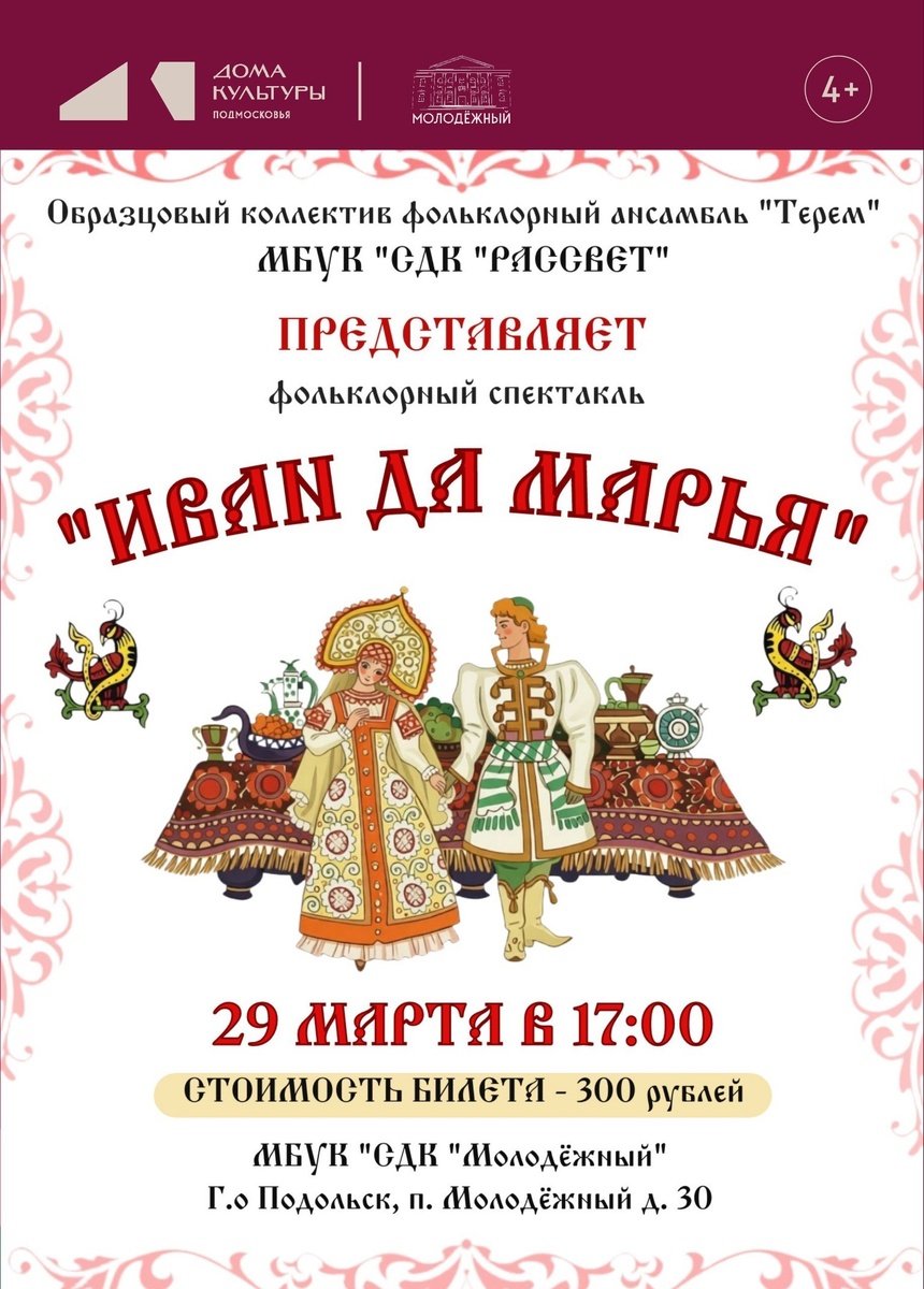 ✨ Музыкальный спектакль «Иван да Марья» в поселке Молодежный Показывает - Образцовый фольклорный ансамбль «Терем» 👑 Детей и взрослых ждёт захватывающая история: в царстве Царя Евстигнея Соловей-разбойник не даёт покоя жителям, а смелый солдат Иван решает всех спасти. ❤️ Все вырученные средства от представления будут направлены на поддержку III Открытого молодёжного фольклорного фестиваля «Традиция». 🚫 Возраст: 3+ 📆 29.03.2026 🕒 17:00 🏢 СДК «Молодежный» 📍 г.о. Подольск, пос. Молодёжный, д.30 💰 Цена: 300 ₽ 🔗 Купить билет: https://clck.ru/3Se5kD ⭐Поддержать канал голосом 🍰Где поесть в Подольске ✅ Мероприятия Подольск https://dzen.ru/id/66ed500f7b5671493eca3fd6 https://vk.ru/podolsk_events http://dzen.ru/podolsk_events
