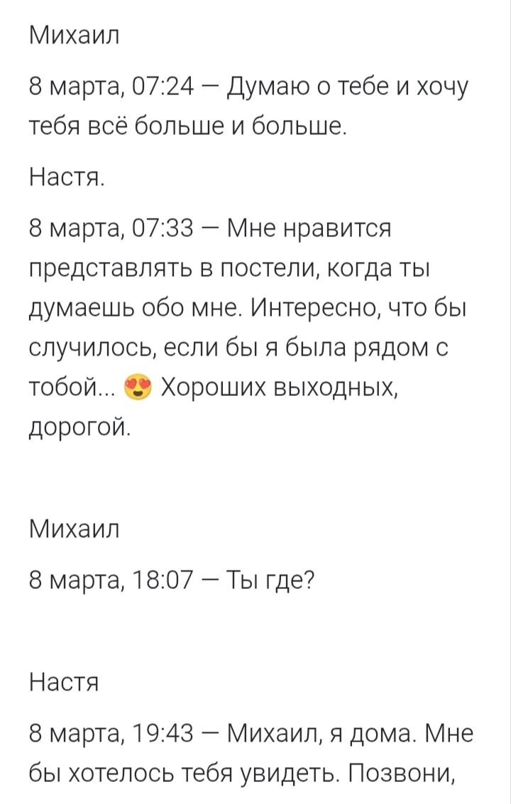 8 марта, 19:43 — Михаил, я дома. Мне бы хотелось тебя увидеть. Позвони, когда сможешь, я дома.