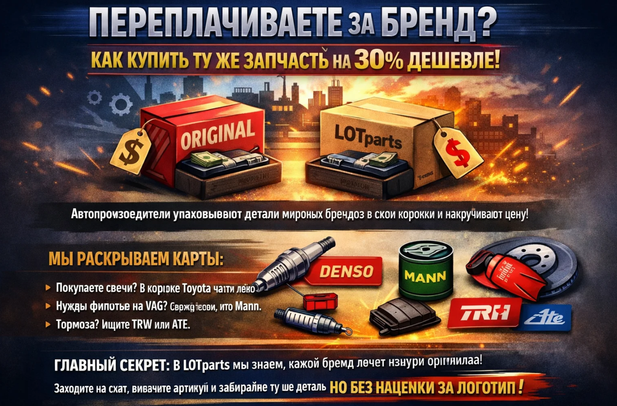 Многие водители до сих пор верят, что «оригинал» делают на секретных заводах автоконцернов. Спешим расстроить: автопроизводители сами почти ничего не производят! Они упаковывают детали мировых брендов в свои коробки и накручивают цену. МЫ РАСКРЫВАЕМ КАРТЫ: ГЛАВНЫЙ СЕКРЕТ: В LOTparts мы знаем, какой бренд лежит внутри оригинала. Заходите на сайт, вбивайте артикул и забирайте ту же деталь НО БЕЗ НАЦЕНКИ ЗА ЛОГОТИП. Экономия до 30% — это не сказка, это знание рынка!