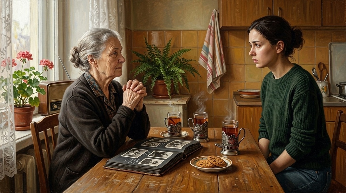Не потому что не хотела знать. А потому что поняла: это вопрос не для сегодня. Не для первой встречи, не за холодным чаем в подстаканниках, не при Антоне, который листает страницу с тётей Галей и хохочет. Это вопрос для другого разговора. Для того, которого ещё не было – и который, может быть, когда-нибудь будет.