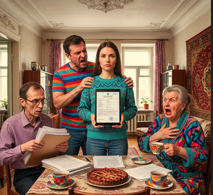 В комнате пахло выпечкой. На столе лежал тот самый пирог с рыбой. И наглая стопка бумаг. Рядом со свекровью сидел щуплый мужчина в очках — «свой юрист».