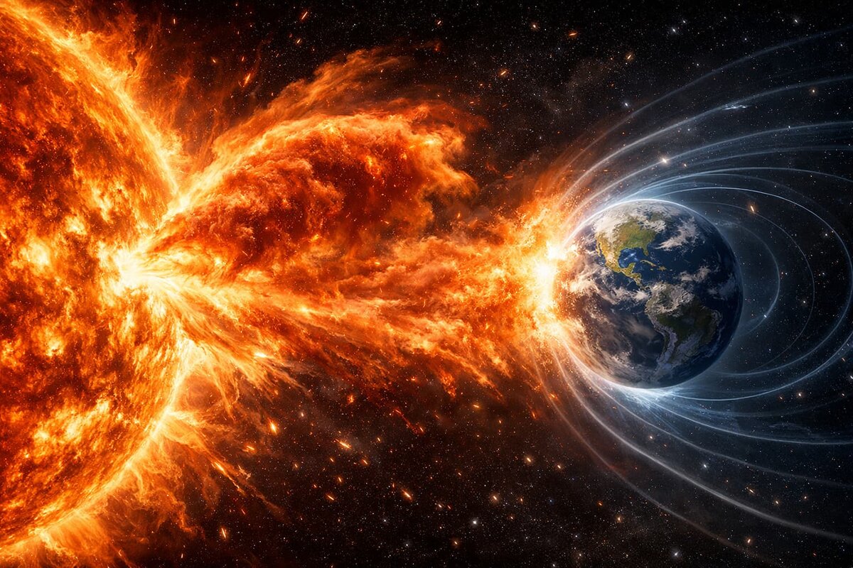 Коронографы и профили рентгеновского излучения зафиксировали на Солнце крупный выброс плазмы. По данным на 28 марта, центр облака движется под углом около 60° от направления на Землю и заметно смещён вниз относительно плоскости эклиптики. Вероятность прямого удара по нашей планете оценивается как низкая — возможны только краевые касания самыми внешними периферийными частями. Скорость распространения плазмы составляет ориентировочно 800–1000 км/с, время подлёта к орбите Земли при такой траектории — 2–3 суток. Выброс относится к классу корональных масс (CME) с широким фронтом. Его источник — активная область на обратной стороне Солнца, которая начала выходить на видимый диск. Несмотря на то, что центр облака уходит в сторону, периферийные слои могут задеть магнитосферу Земли, вызвав слабые или умеренные геомагнитные возмущения (G1–G2 по шкале NOAA). Основная опасность — для аппаратов за пределами магнитосферы. В ночь с 1 на 2 апреля запланирован старт лунной миссии NASA — Artemis 2: кора