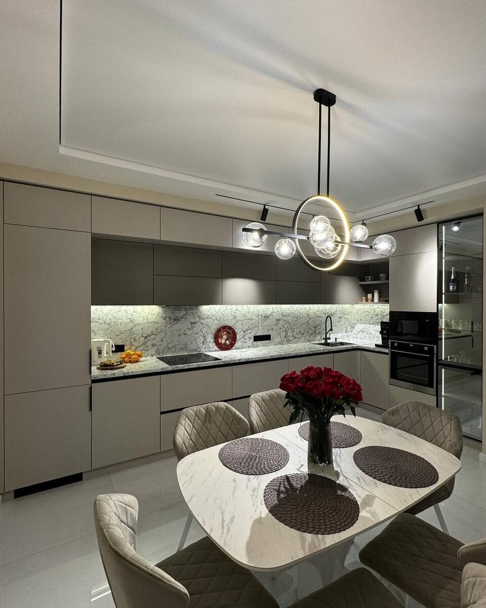 Здесь нет случайных решений — только сочетание материалов и функций, которые реально работают. 🔹 Фасады: МДФ — матовая эмаль или ПВХ soft-touch Цвета: грейж и графит 🔹 Столешница и фартук: керамогранит или кварцевый агломерат (текстура мрамора Statuario / Calacatta) 🔹 Открывание: нижние — чёрный профиль Gola верхние — push-to-open 🔹 Витрина: чёрный алюминиевый профиль + закалённое стекло 🔹 Освещение: чёрная трековая система + врезная LED-подсветка 🔹 Сантехника: чёрный матовый смеситель + подстольная мойка 🔹 Фурнитура: петли и направляющие с доводчиками 🔹 Обеденная зона: стол с мраморной текстурой + стулья с мягкой обивкой Итог — кухня, которая выглядит спокойно, дорого и не перегружена лишними деталями. В ДК Мебель мы собираем такие проекты как систему — где всё сочетается и работает каждый день. Когда материалы и детали подобраны правильно — кухня выглядит дороже без лишних усилий.