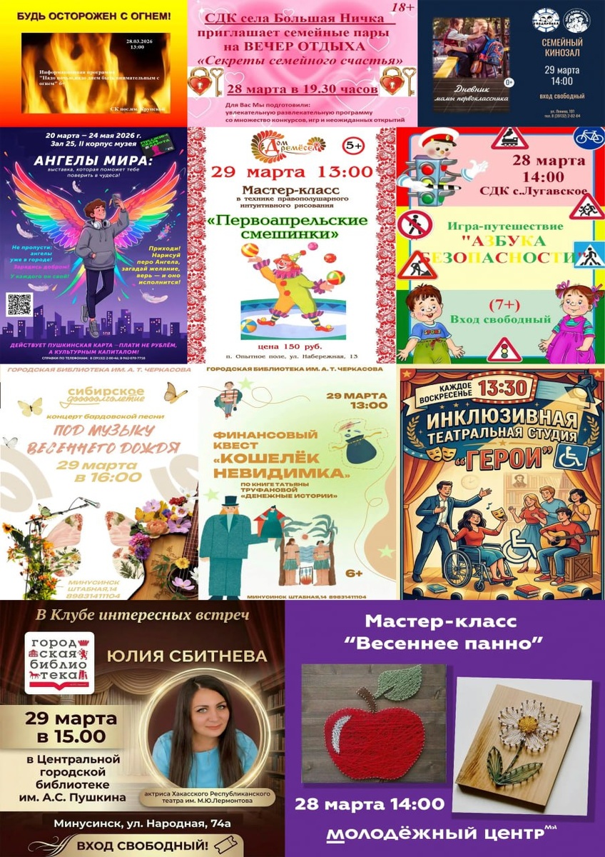🏛 Погружение в историю и искусство Все выходные в Минусинском краеведческом музее им. Мартьянова экспозиции работают: 28 марта — с 10.00 до 19.00, 29 марта — с 10.00 до 18.00: В эти дни и часы можно также посетить экспозиции отдела «Мемориальный музей «Дом-квартира Г. М. Кржижановского и В. В. Старкова» и отдела «Музей декабристов» 🏅 Спорт и активный отдых 28 и 29 марта, 10.00 — всероссийские соревнования по дзюдо среди юношей и девушек до 15 лет памяти ЗТР В.П. Щедрухина (с/к им. Шумилова, ул. Свердлова, 105) 28 марта 10.00 — муниципальный этап фестиваля ВФСК «ГТО» среди трудовых коллективов (с. Малая Минуса, ЦФКиС «Енисей», ул. Микрорайон, 10 А) 14.30 — открытый чемпионат и первенство Минусинска по спортивному ориентированию (кросс-спринт) (лесной массив «Ясная поляна») 29 марта 10.00 — первенство Минусинска по волейболу среди команд девушек 2009 г.р. и младше (Южный филиал им. Л.А. Буданова, ул. Комарова, 5А) 📚 Библиотеки: от игротек до театральных встреч 28 марта: 11.00–18.00
