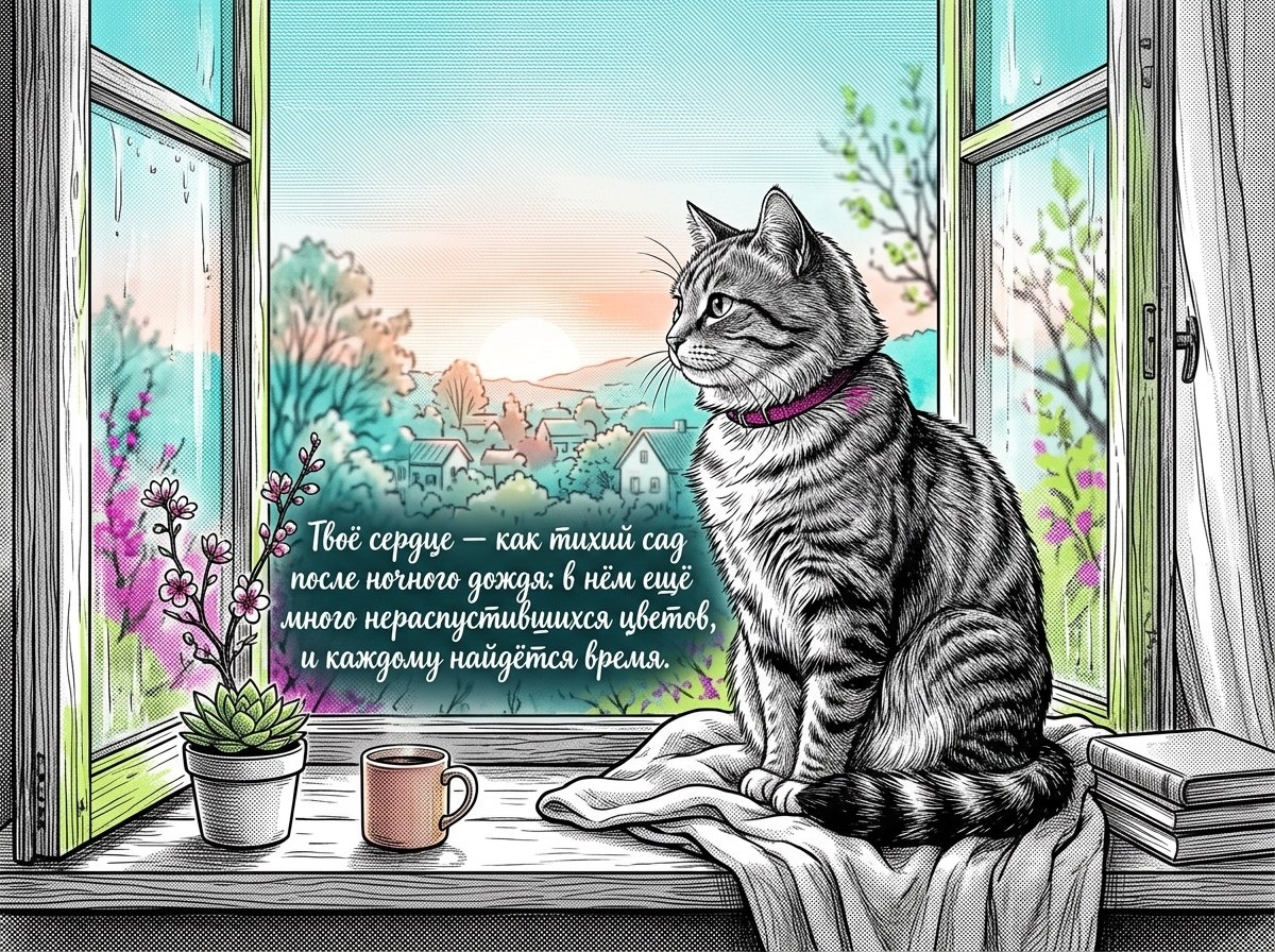 Говорю с тобой я, мудрый кот, который умеет встречать рассветы в тишине подоконников. Сегодня, в этот весенний мартовский день, мир чуть-чуть приоткрывает тебе дверцу к новому началу, как окно, в которое осторожно заглядывает свет. Я знаю: впереди заботы, дела и шум. Но сейчас — короткое мгновение, когда ты можешь дышать глубже, чем обычно, и позволить себе быть просто живым. Твоё сердце — как тихий сад после ночного дождя: в нём ещё много нераспустившихся цветов, и каждому найдётся время. Доверься этому утру, как я доверяю мягкому солнечному пятну на полу — оно всегда возвращается. Пусть сегодняшний день бережно поддержит тебя: каждое небольшое действие станет шагом, а каждый шаг — подтверждением твоей внутренней силы. Я, кот, верю в твою способность мягко, но уверенно идти своим путём, слушая себя и мир, как весенний лес слушает первый тёплый ветер.