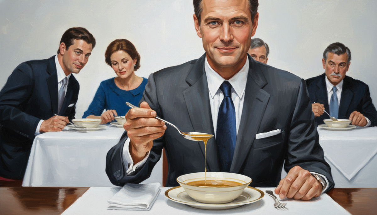 Вы можете быть в дорогом пиджаке, говорить умные вещи и улыбаться в нужные моменты. Но стоит принести суп — и всё. Люди за столом уже делают выводы. Причём молча. Это не преувеличение. Столовый этикет существует не для красоты — он возник как система распознавания: свой или чужой, воспитанный или нет. И ни одно блюдо не тестирует человека так наглядно, как суп. Именно потому, что есть его «неправильно» — легко. А правильно — нужно знать. Начнём с того, что многие делают неосознанно. Суп зачерпывают от себя — то есть ложку ведут от края тарелки, ближнего к вам, к дальнему краю. Движение плавное, без погружения ложки до самого дна с характерным звуком. Этот приём пришёл из Франции XVIII века и прижился по всей Европе — считалось, что так минимизируются брызги и сохраняется достоинство. Но главное — это ложка в руке. Держат её не в кулаке. Ложка лежит между указательным и средним пальцами, большой палец сверху фиксирует. Это позиция, при которой рука выглядит расслабленно. Кулак — это нап