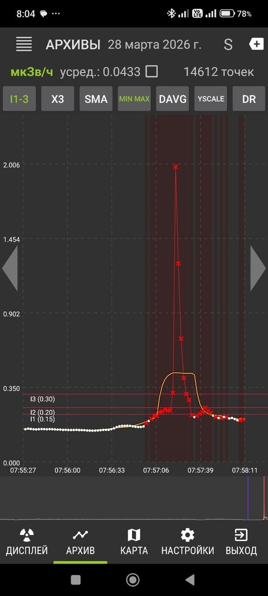 ! И снова досмотровой сканер РЖД на станции Пермь-2. Этот график показывает мощность дозы при проходе через досмотровую рамку рядом со сканером. Фонит прилично 2 мкЗв/ч. Мой Радекс-1008, который прошел пекло сканера, буквально за несколько десятков секунд набрал дозу 1 мкЗв.