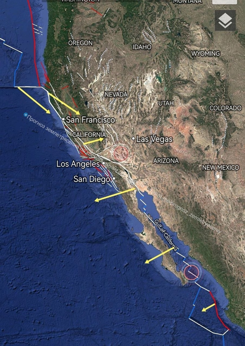 Тихоокеанскую плиту от Мексики и до северной Калифорнии. В течение 9 дней есть вероятность более сильного землетрясения по данным зонам. ==== Against the background of two M4+ earthquakes per day in the Gulf of California and southern California, 2 M7+-level CSTIs are observed tracing the Pacific Plate from Mexico to northern California. Within 9 days, there is a possibility of a stronger earthquake in these zones.