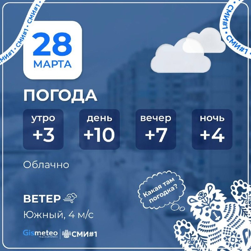 🌧️ Облачная и тёплая погода ожидается сегодня в Челябинске Днём синоптики прогнозируют +10°. Вечером сохранится такая же температура. Ожидается слабый ветер до 4 м/с. Всем хороших выходных ❤️ 📲 Читайте нас в MAX 😊 Подписаться | Прислать новость