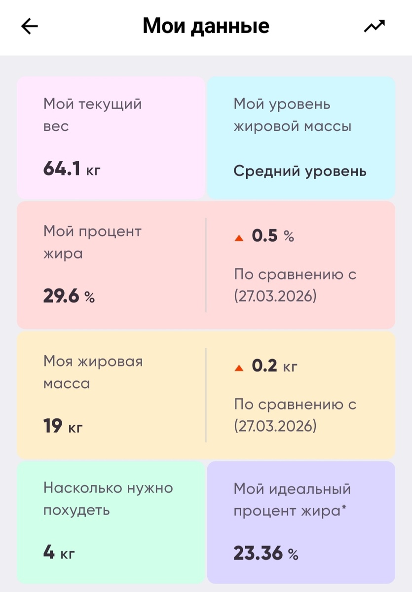 Вес пошел вниз. -0,5 кг, 64,1. Объемы пошли вширь по +0,5 см, кроме шеи. Процент жира тоже повысился на 0,5, 29,6%.