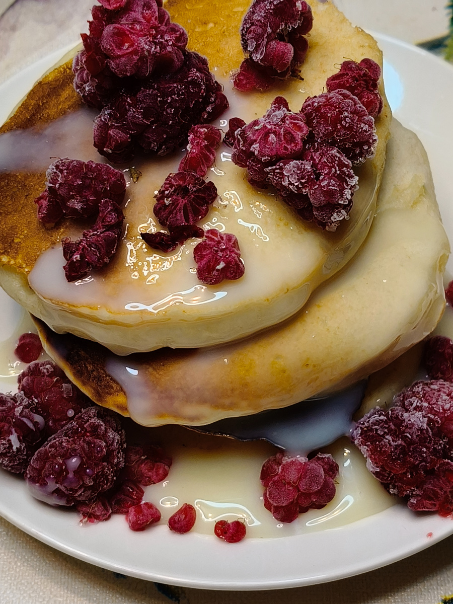 Это очень быстро. Очень. Быстрее, чем блины, а жира меньше, чем в традиционных оладушках, если для вас это важно. И их правда можно приготовить утром. Потому что быстро. А вообще я все хочу попробовать их в традиционном варианте - с кленовым сиропом и голубикой. Но пока у меня только сгущенка и замороженная малина. Получается 12 штук. Нас трое, так что по четыре на порцию. Возьмите: 1 яйцо 30 гр сахара 1/2 ч.л. соли 1 пакетик ванильного сахара (можно не добавлять) - 8 гр 200 мл молока 25 гр растительного масла без запаха 180 гр муки 6 гр разрыхлителя Итак: Яйцо + сахар + ванильный сахар + соль смешайте вилкой или венчиком до однородной массы (возьмите достаточно глубокую миску, потому что потом мы будем добавлять туда муку). Добавьте молоко и растительное масло, хорошо перемешайте. В отдельную миску просейте муку, смешанную с разрыхлителем. Я просеиваю два раза, чтобы точно все перемешалось, но можно и один. По времени это занимает меньше минуты, поэтому два. Мне так спокойнее, но