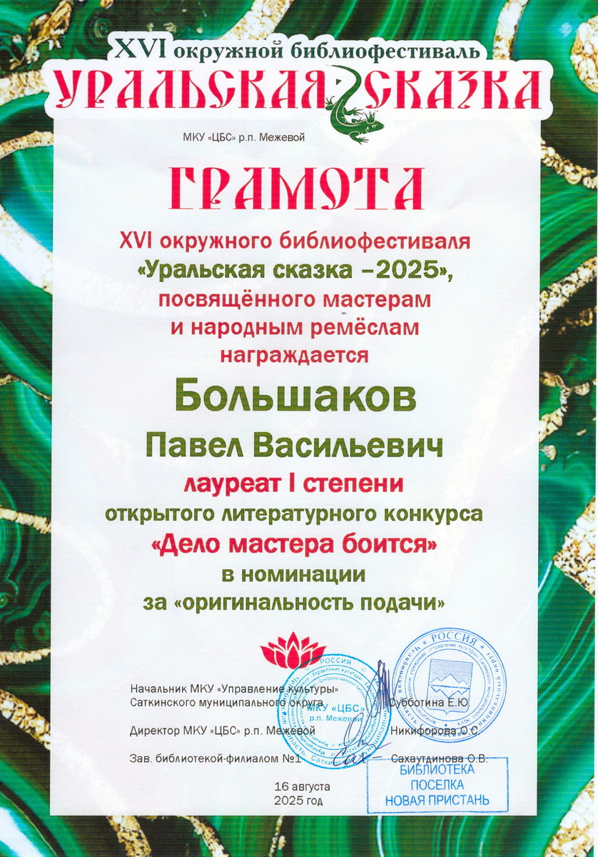Медитировать, значит достигать гармонии с собой. Это умеют делать многие мастера в горной Сатке, которая располагается в самом красивом месте Уральских гор – в районе высокогорного заповедника «Зюраткуль». О них я писал и за свои рассказы получал грамоты библиотеки "Новая пристань". И горжусь такими наградами потому, что город Сатка признан Москвой единственным на Южном Урале "Литературным городом России"... Когда путешествуешь по Уралу, встречаешь столько удивительных людей с богатой душой. В городе Сатке и в окрестностях, мне кажется, их встречаешь чаще всего. На «Львовских литературных чтениях» в посёлке Межевой я встретился с Галиёй Арслановой. Она не просто делает народные авторские куклы. Галия Рафкатовна их создаёт по мотивам живописных картин и книг знаменитого живописца Сатки Александра Суханова. 26 марта она мне подарила «Богиню Сать» на коне со словами: «Когда начинаешь создавать народную игрушку, в тебе просыпается национальный код». Но мало того, что Галия дарит своеобразн