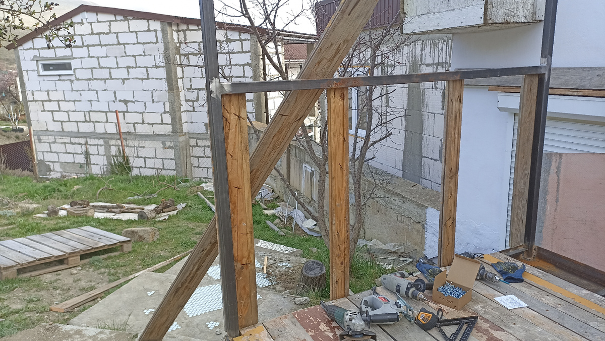 Было почти безветренно и довольно тепло. Куртки нараспашку, сын вообще в майке. Одну сторону обшили, получилось крепко, можно лист ОСБ прикручивать. Но