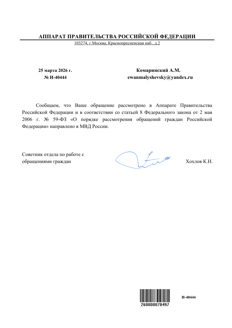 С адреса электронного почтового ящика: pisma@aprf.gov.ru на адрес электронного почтового ящика: ewanmalyshevsky@yandex.ru от 26 дня месяца Марта 2026 года время: 22:15 поступил ответ. Настоящий ответ содержал тип файла: Adobe Acrobat Document (.pdf), размер: 83,6 КБ (85 693 байт). Таким образом, был получен ответ от АППАРАТ ПРАВИТЕЛЬСТВА РОССИЙСКОЙ ФЕДЕРАЦИИ 25 марта 2026 г. № И-40444 за росписью Советник отдела по работе с обращениями граждан и подписью Хохлов К.Н. Фотографию ответа правительства (рисунок PNG (.png) размер: 58,1 КБ (59 550 байт) прилагаю следующую. По тексту ответа указано: Сообщаем, что Ваше обращение рассмотрено в Аппарате Правительства Российской Федерации и в соответствии со статьей 8 Федерального закона от 2 мая 2006 г. № 59-ФЗ «О порядке рассмотрения обращений граждан Российской Федерации» направлено в МВД России. Далее есть "ГОСТ Р 7.0.97-2025. Национальный стандарт Российской Федерации. Система стандартов по информации, библиотечному и издательскому делу. О