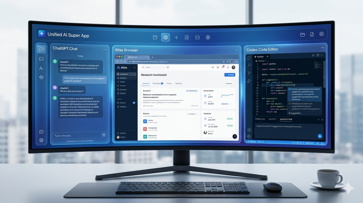 OpenAI планирует объединить ChatGPT, браузер Atlas и модель Codex в единое приложение для максимальной продуктивности. Компания пока не называет дату выхода. ChatGPT — чат-интерфейс для диалога с ИИ. Генерация текста, анализ данных, ответы на вопросы. Atlas — ИИ-браузер для веб-поиска и навигации. Автоматический сбор информации с сайтов, сравнение источников, выделение фактов. Codex — модель для программирования. Написание кода, дебаггинг, рефакторинг, генерация функций по описанию. Бесшовная работа. Переключение между задачами без копирования данных. Начните исследование в Atlas, продолжите анализ в ChatGPT, реализуйте идею в Codex. Общий контекст. Все три компонента видят историю работы. ИИ помнит предыдущие запросы и учитывает их в новых задачах. Экономия времени. Не нужно открывать десятки вкладок. Одно приложение заменяет браузер, текстовый редактор и IDE. Автономное написание кода. Опишите функцию — Codex создаст рабочий код. Atlas найдёт документацию и примеры. ChatGPT объяснит