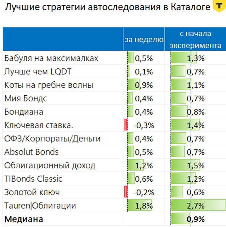 ΡΡΡΠ°ΡΠ΅Π³ΠΈΠΉ Π°Π²ΡΠΎΡΠ»Π΅Π΄ΠΎΠ²Π°Π½ΠΈΡ ΠΈΠ· ΠΊΠ°ΡΠ°Π»ΠΎΠ³Π° ΠΡΠ»ΡΡΠ°, Π° Π·Π°ΡΠ΅ΠΌ ΡΠΎΠΊΡΠ°ΡΠΈΠ»ΠΈ ΡΠΏΠΈΡΠΎΠΊ Π΄ΠΎ 12. ΠΠ° ΠΊΠ°ΠΆΠ΄ΡΡ ΡΡΡΠ°ΡΠ΅Π³ΠΈΡ Π²ΡΠ΄Π΅Π»ΠΈΠ»ΠΈ ΠΏΠΎ 100 ΡΡΡΡΡ ΡΡΠ±Π»Π΅ΠΉ. ΠΠ΄Π½Π° Π΄Π°ΡΠ° ΡΡΠ°ΡΡΠ°, ΠΎΠ΄Π½Π° ΡΡΠΌΠΌΠ°, ΠΏΡΠΎΠ·ΡΠ°ΡΠ½ΡΠ΅ ΡΡΠ»ΠΎΠ²ΠΈΡ Π²ΡΠ±ΠΎΡΠ° πΠΠΊΡΠΏΠ΅ΡΠΈΠΌΠ΅Π½Ρ ΠΈ ΠΏΠ°ΡΠ°ΠΌΠ΅ΡΡΡ: https://www.tbank.ru/invest/social/profile/Kot.Finance/03698806-24c1-4c30-a465-6309308886d1/ πΠΠΎΠ΄ΡΠΎΠ±Π½ΠΎ ΠΏΡΠΎ ΠΊΠΎΠΌΠΈΡΡΠΈΠΈ: https://www.tbank.ru/invest/social/profile/Kot.Finance/0deaee7d-fe17-4f18-88ab-5129598265ce ΠΡΠΎΠ³ΠΈ Π°Π²ΡΠΎΡΠ»Π΅Π΄ΠΎΠ²Π°Π½ΠΈΠΉ Ρ 6 ΠΏΠΎ 22 ΠΌΠ°ΡΡΠ° Π²ΠΊΠ»ΡΡΠ°ΡΡ ΠΊΠΎΠΌΠΈΡΡΠΈΠΈ, ΠΏΡΠΎΡΠΊΠ°Π»ΡΠ·ΡΠ²Π°Π½ΠΈΠ΅, ΠΈ ΠΏΡΠΎΡΠ΅Π΅. 1οΈβ£Tauren|ΠΠ±Π»ΠΈΠ³Π°ΡΠΈΠΈ +2,72%: Π² ΠΌΠΎΠΌΠ΅Π½ΡΠ΅ ΡΡΡΠ°ΡΠ΅Π³ΠΈΡ ΠΏΡΠΈΠ±Π»ΠΈΠΆΠ°Π»Π°ΡΡ ΠΊ 5% Π·Π° ΡΡΠ΅Ρ Π°Π³ΡΠ΅ΡΡΠΈΠ²Π½ΠΎΠΉ ΡΡΠ°Π²ΠΊΠΈ Π½Π° Π΄Π»ΠΈΠ½Π½ΡΠ΅ ΠΠ€Π ΠΈ Π²Π°Π»ΡΡΡ 2οΈβ£ΠΠ±Π»ΠΈΠ³Π°ΡΠΈΠΎΠ½Π½ΡΠΉ Π΄ΠΎΡ