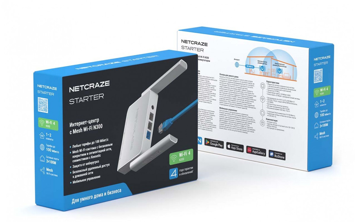 Netcraze Starter и Netcraze Start — младшие модели Netcraze, оснащенные самыми базовыми возможностями по передаче беспроводной сети. В них используется Wi-Fi 4 — стандарт, представленный еще в 2009 году. Он обеспечивает максимальную скорость 300 Мбит/с и поддерживает лишь SU-MIMO — поток данных не умеет работать с несколькими устройствами одновременно, что чревато задержками и уменьшением общей скорости сети при подключении большого количества девайсов.