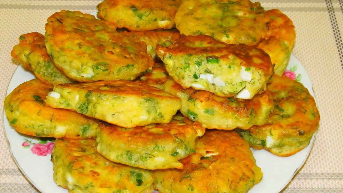 Нашла рецепт, который просто идеален для нас – быстро и очень вкусно! Я большая поклонница быстрых блюд, а если бы его еще кто-то приготовил, то вообще жизнь удалась! Но и самой готовить несложно, так что иногда получается! Эти оладьи по вкусу очень похожи на пирожки – пышные и совсем не жирные. Я часто их готовлю, и фруктовые, и овощные варианты тоже нравятся. Кстати, очень рекомендую попробовать с щавелем – получается интересный вкус! Вариантов масса, но именно этот – мой абсолютный фаворит. Попробуйте, вам точно понравится! Вот что нам понадобится. Чаще использую кислое домашнее молоко. Подготовку начну с нарезки зелени. Беру зелёный лук и петрушку. Позже решила добавить и укроп. В это время года зелени хочется всегда и много. Яйца. Их нарежу небольшими кусочками. Дальше тесто. Самый лучший вариант это кислое домашнее молоко, обязательно тёплое. Проверено! Кладу яйцо, соль и сахар, растопленное сливочное масло. Теперь сода. Её всегда гашу уксусом, так она со своей задачей справ