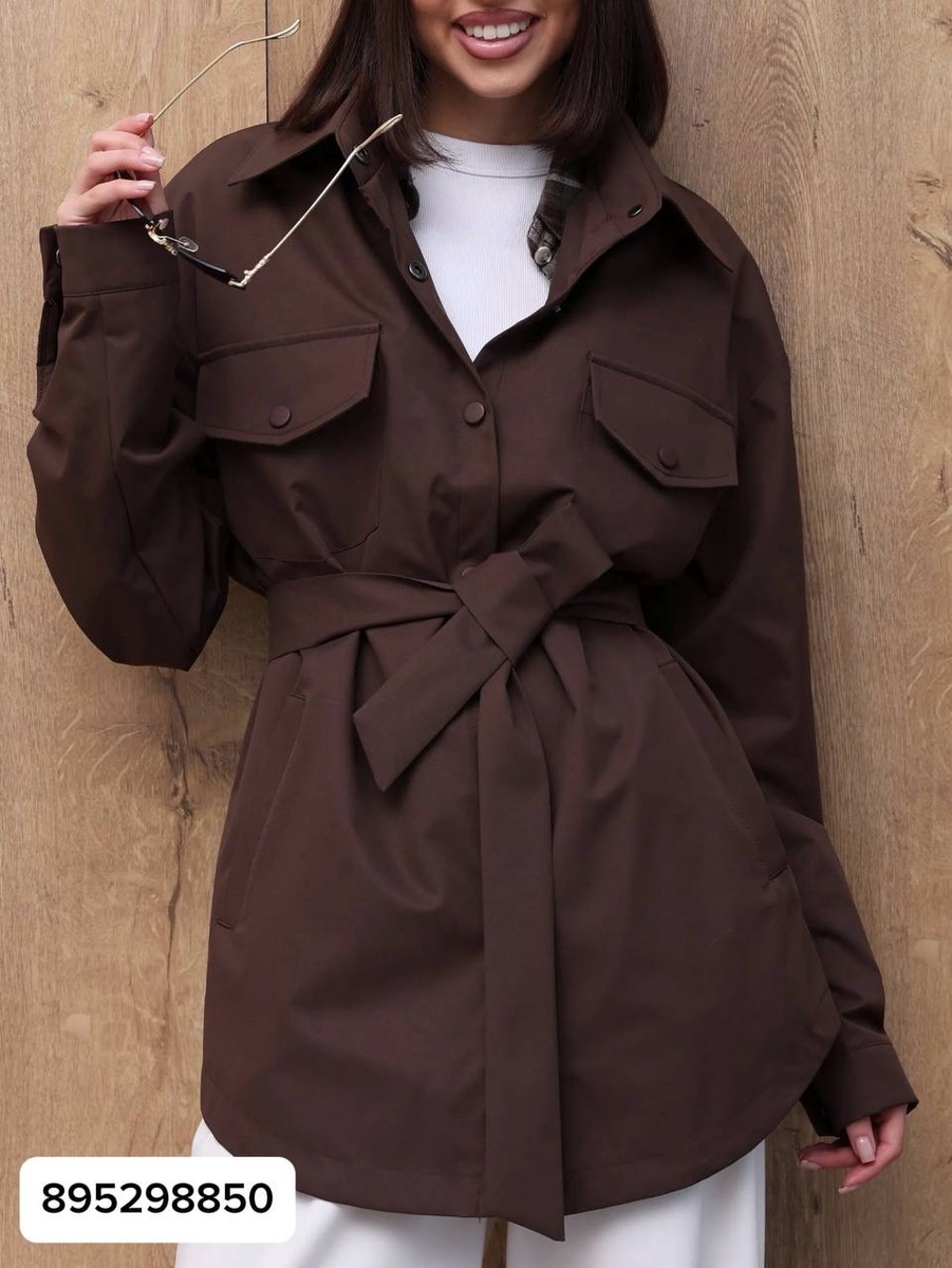 Этот образ выглядит собранно, дорого и очень выразительно. В нем удачно сочетаются мягкая архитектура удлиненной ветровки и более четкая, структурная форма мини-юбки. Общая гамма в шоколадных тонах делает комплект цельным, гармоничным и визуально «дорогим». Такой образ прекрасно подойдет для городской весны, прогулок, встреч, свиданий и тех случаев, когда хочется выглядеть эффектно без лишней вычурности.
