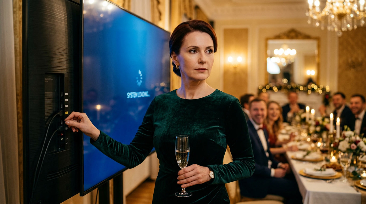 Вера стояла у телевизора. Тёмно-зелёное платье, небольшие серьги с камнем, каштановые волосы убраны назад. Бокал держала в левой руке, правой — тянула кабель к разъёму на панели. Руки не дрожали. Это было важно — она проверила заранее, ещё утром, когда Михаил уехал за цветами.