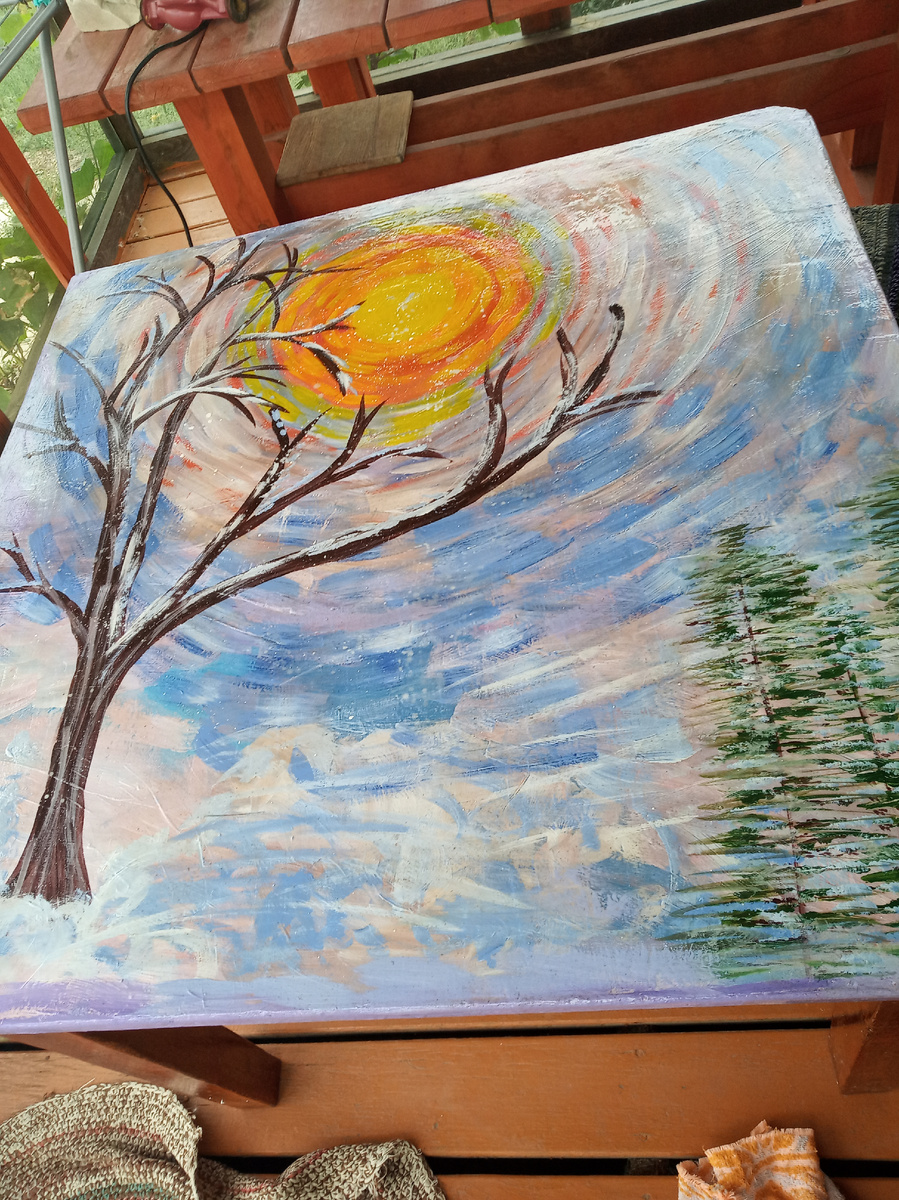 Вот эта картина выполнена мной на крышке старого стола, который был еще у моей бабушки. Клеенку обычную не хочется, вот я и экспериментирую. Здесь гуашь и залакировано, но пришлось накрыть прозрачным силиконом т.к. стол обеденный и нагрузки не выдерживает такое произведение, откалывается кусочками. До этого было ситцевое покрытие, декупаж. Тонкая ткань это самое лучшее! Приклеить ситец, высушить и отлакировать. См. ниже. Вот такой стол у меня был, но захотелось что-то другое. Отодрала ...нарисовала. Неудовлетворение полное. Прошлым летом приклеила красивый платок, но тоненький надо было. И неправильно купила лак. Надо бесцветный, а я взяла прозрачный. Это очень разные лаки оказались. Даже не буду показывать , какой у меня сейчас стол. Летом переделаю. Сейчас меняю обои. К пасхе сделаю. Были вот с такими шариками. Это на кухне еще не заменила.Почему они мне понравились? У меня изба(!) деревенская с семью окнами, кругом лоскутное шитье и картинки на стенах. Все пестрое, мне это нравит