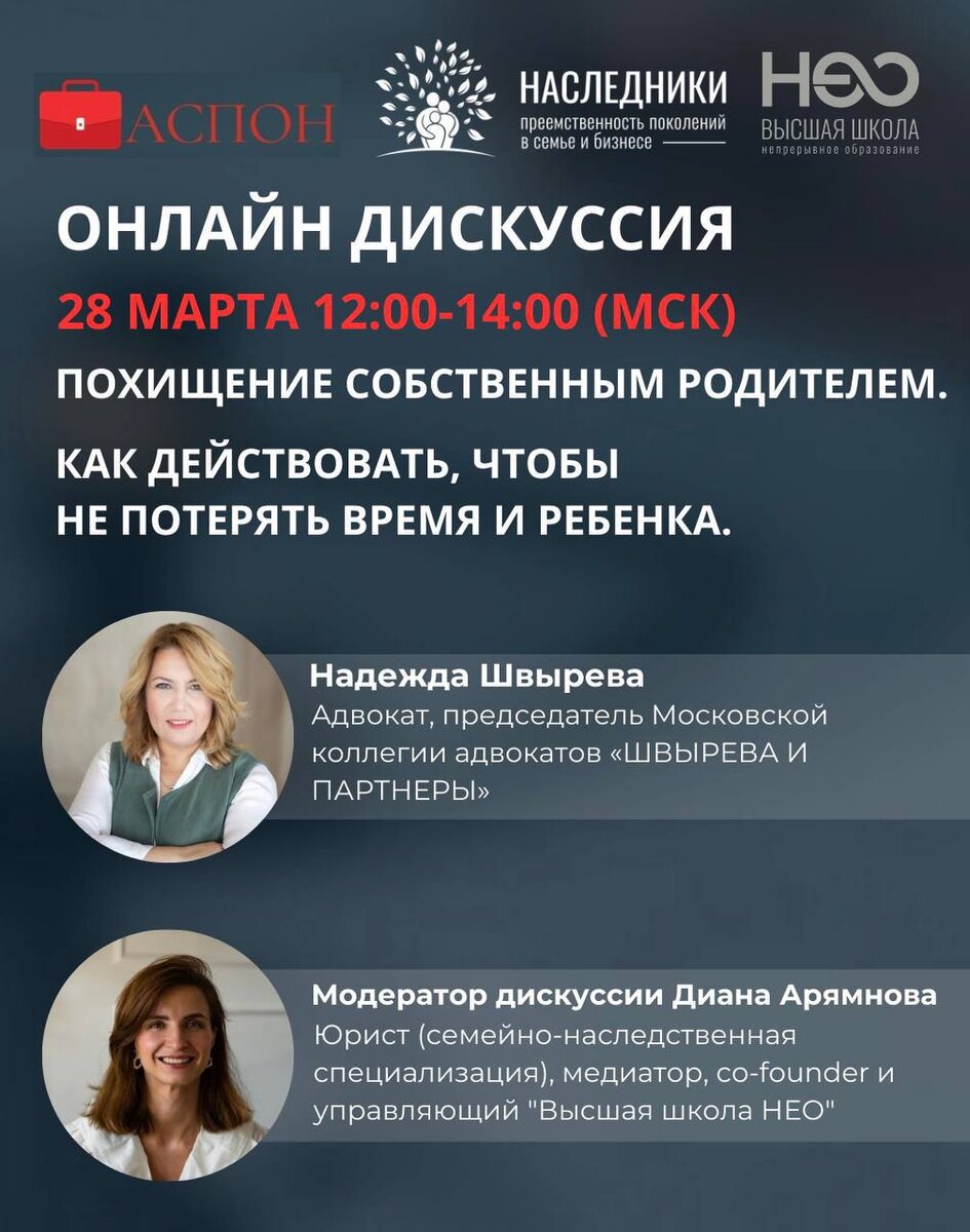 ! Второй родитель забрал ребенка из детского садика/школы/на выходные/каникулы и не вернул. «Похищение собственным родителем: как действовать, чтобы не потерять время и ребёнка» Я всегда читаю ваши вопросы и комментарии под постами, поэтому сегодня будет вебинар на очень злободневную тему. С 12:00 до 14:00 (мск) с адвокатом Надеждой Швыревой мы поговорим: 📍какие необходимы превентивные меры безопасности, когда Вы решили разойтись со вторым родителем ребенка и есть подозрения, что ребенок будет средством давления на вас и манипуляций. 📍что делать, если твоего ребенка второй родитель забрал из школы/детского садика и не сообщает местонахождение сына/дочери; 📍как быть, если второй родитель не возвращает ребенка после выходных/ каникул и выходит с иском об определении места жительства; 📍 полиция бездействует, органы опеки не оказывают поддержки, а ребенок все чаще транслирует, что не хочет возвращаться . Адвокат Надежда Швырева поделится своим многолетним практическим опыт