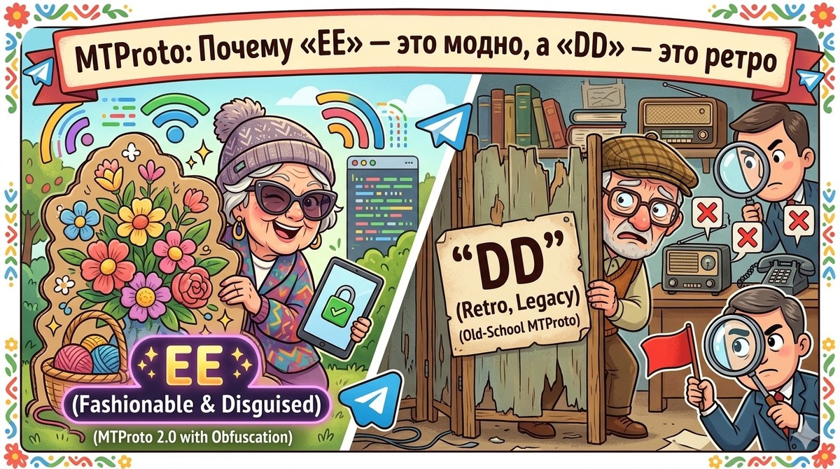 Мои фанаты! Многие спрашивают, как же так получается: интернет вроде как «закрывают», а мои открытки с котиками всё равно до вас долетают? Рассказываю по-простому про их секретный шифр — MTProto. Представьте, что наш Телеграм — это закрытый клуб любителей рассады. Чтобы никто чужой не прочитал наши рецепты огурцов, сообщения прячутся в специальные «конверты» с секретными кодами. И коды эти бывают трёх видов: Обычный код (цифры и буквы): Это как простое письмо. РКН видит, что это письмо, и может начать задавать вопросы. Не всегда надежно! Код «DD»: Это старый дедовский метод. Вроде как надели на письмо маску, но маска старая, из газеты вырезанная. Наш строгий надзор (РКН) таких «шпионов» вычисляет на раз-два. Маскировка устарела, внучата такое уже не носят! Код «EE» (Самый хитрый!): Это наша гордость. «EE» — значит с обфускацией. Не пугайтесь слова, по-нашему это — Маскировка. Это когда мы берем письмо, но заворачиваем его так, будто это не секретное послание, а просто шум ветра ил