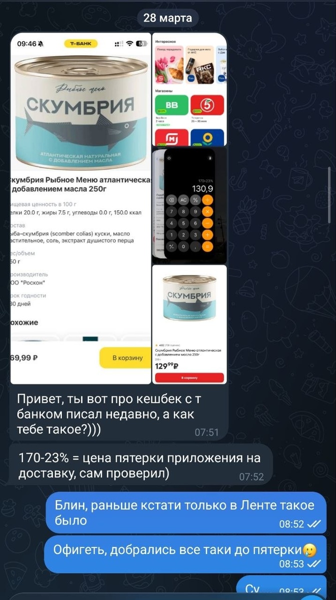 ((( Благо бдительный коллега написал мне в личку! Спасибо ему! Короче, Т-банк внутри своего приложения, накидывает к цене продуктов, а потом даёт на них кэшбэк. Раньше такая тема была только у магазина Лента. Теперь видимо добрались и до Пятёрочки😅 Друзья, кто сверялся с ценами в магазах и доставке за последнее время?