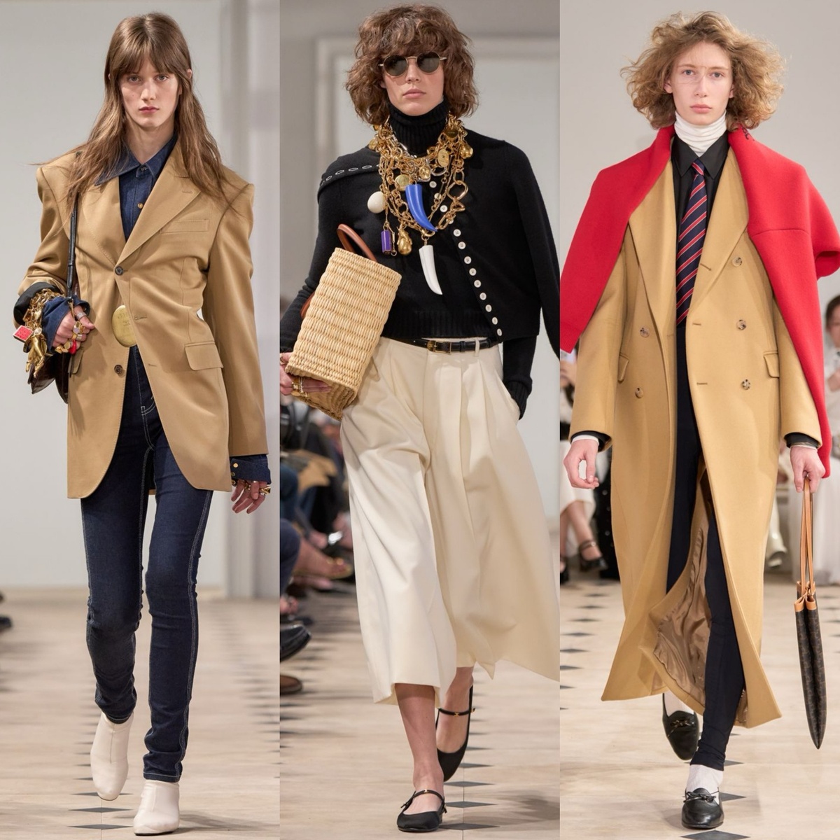 Значительную роль в коллекции сыграли аксессуары. Райдер представил разнообразный ассортимент сумок: от объёмных кожаных тоутов и плетёных корзин до структурированных клатчей изящной формы. Каждая модель демонстрировала обновлённую визуальную идентичность Celine — через культовую букву «C» или винтажную монограмму «Triomphe».