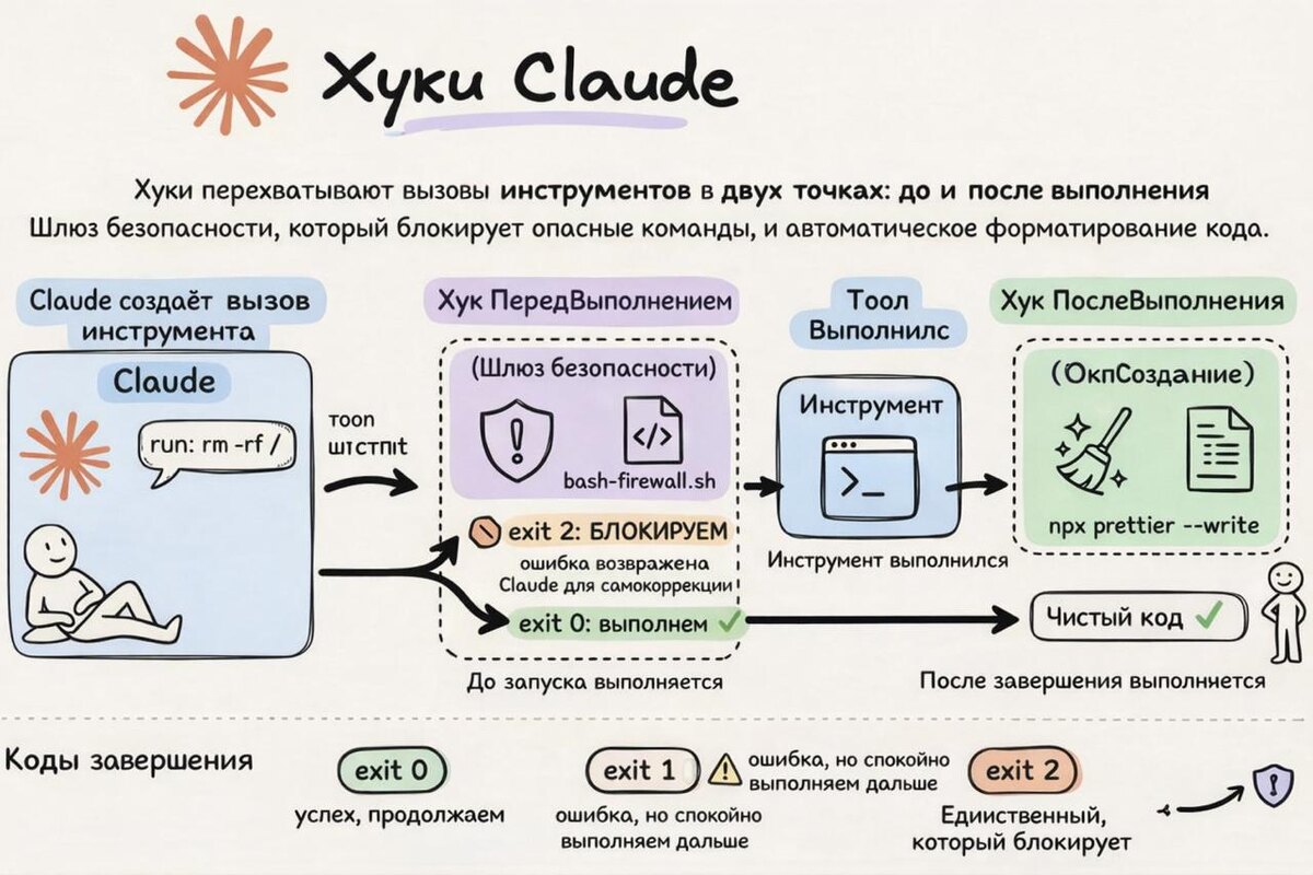 Многие ограничиваются CLAUDE.md и на этом останавливаются. Но это всего лишь рекомендации для модели, а не строгие правила. Claude старается им следовать, но не всегда. Отсюда и проблемы: может забыть прогнать линтер, выполнить нежелательную команду или «закончить» задачу с падающими тестами. Hooks решают это иначе. Они не про просьбы, а про контроль. Любое действие проходит через этапы - до выполнения, после и перед завершением. И в каждый из этих моментов можно встроить свои проверки. Например, перед запуском команды можно отфильтровать опасные действия и просто не дать им выполниться. После - автоматически привести код в порядок. А перед завершением — не выпустить результат, пока тесты не проходят. Важный момент - коды завершения. Только exit code 2 действительно останавливает выполнение и возвращает ошибку обратно модели. Остальные коды не дают нужного контроля. В итоге разница простая: CLAUDE.md - это возможность того, что всё будет сделано правильно Hooks - это гарантия, что