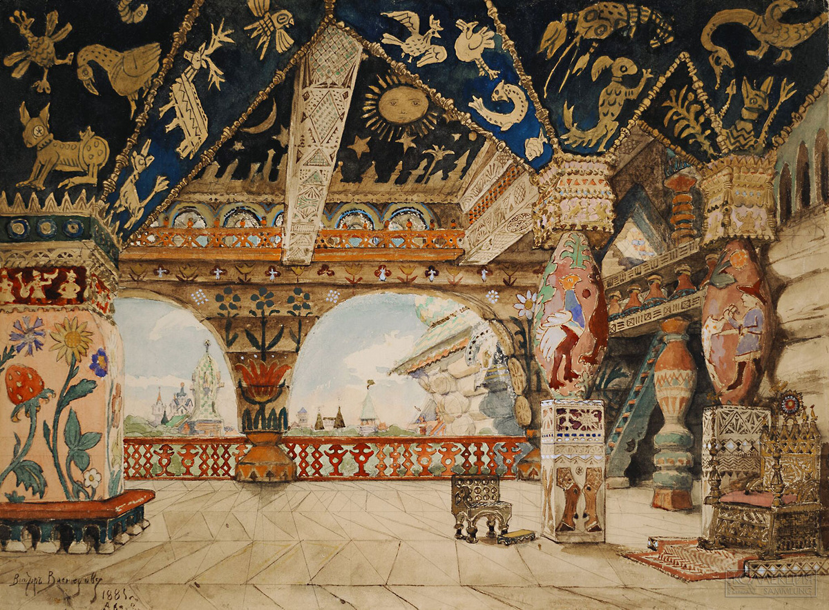 УРОК №29. Второе действие весенней сказки «Снегурочка». Прошла ещё одна весенняя неделя, и мы продолжаем путешествие по сказке А. Н. Островского «Снегурочка». www.уроки-музыки.рф Представьте, что занавес закрыт. Сейчас начнётся второе действие, но вначале прозвучит музыка «Антракта». Прислушайтесь – куда она вас приглашает… (на видео с 44 мин. 52 сек. по 47 мин. 48 сек) https://vkvideo.ru/video-46598842_456241681 СЛАЙД 1. Итак, перед вами царский дворец. «Царь Берендей сидит на золотом стуле, расписывает красками один из столбов. У ног царя сидят на полу два скомороха; несколько поодаль – слепые гусляры с гуслями». Вы услышите «Хор слепых гусляров». Автор пьесы в письме к Чайковскому писал, что при сочинении текста он руководствовался литературным памятником «Слово о полку Игореве», повествующем о неудачном походе русских князей на половцев в 1185 году. Поэтому в куплетах этого хора вам встретится, например, выражение: «глухо стези под копытами стонут». Слово «стезя» означает пут