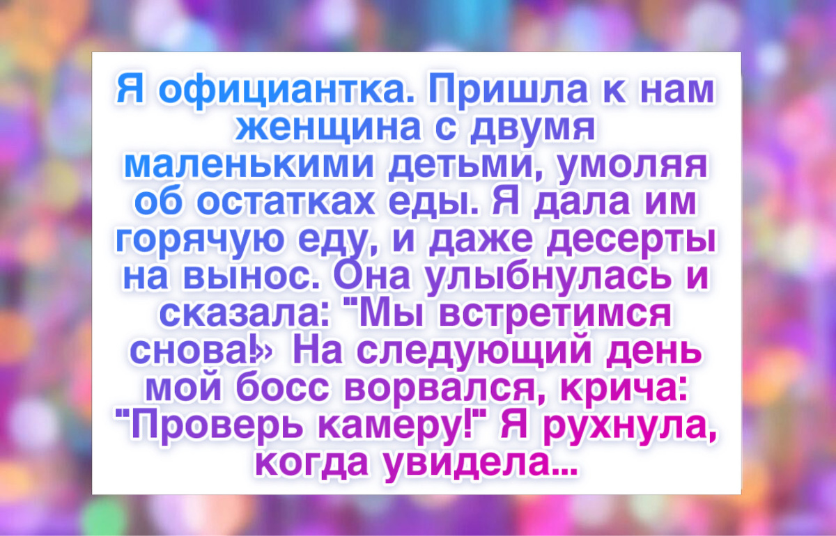 “Я работаю официанткой. Однажды пришла женщина с двумя маленькими детьми и попросила остатки еды. Я дала им горячие блюда и даже десерты с собой. Она улыбнулась и сказала: «Мы еще встретимся». На следующий день начальник ворвался в зал и закричал: «Проверьте камеры!» Я увидела, как отдаю еду, но также заметила, как эта женщина незаметно что-то кладет под держатель для салфеток перед уходом. Начальник увеличил изображение и замолчал. Это был сложенный чек на сумму, которой хватало, чтобы покрыть расходы ресторана на целый месяц. Сзади аккуратным почерком было написано: «Для девушки с добрым сердцем. Позаботьтесь о ней». У меня подкосились ноги. Через три дня она снова пришла, уже одна, в элегантной одежде, с уверенной улыбкой. Оказалось, она известный блогер, который специально приходит в обычные места в простой одежде, чтобы увидеть, как люди относятся к тем, у кого ничего нет. Она села за мой столик, заказала кофе, посмотрела на меня и тихо сказала: «Я же говорила, что мы встретимся». Мне пришлось крепко держать поднос, чтобы руки не дрожали. В тот же день начальник повысил мне зарплату. Но больше всего меня тронуло другое. Один маленький искренний поступок без ожиданий вернул ко мне человека, которого я никогда бы не ожидала увидеть снова.”