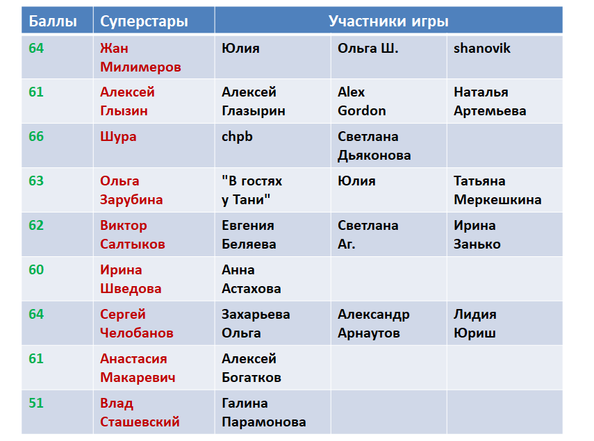 Играли с нами многие читатели, но только самых первых я занесла в таблицу.