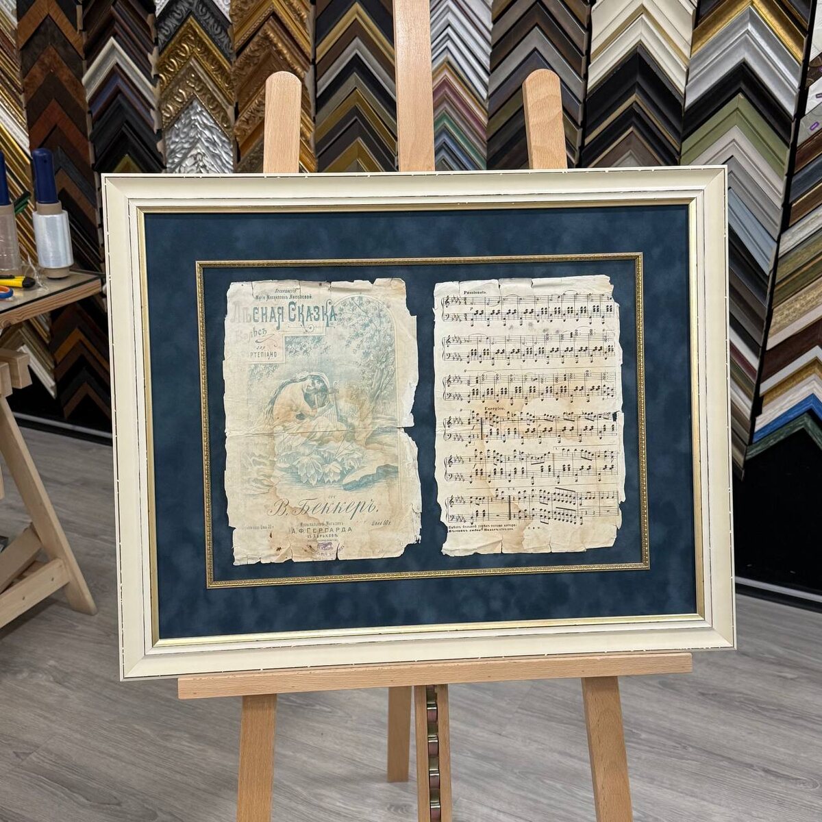Например, Екатерина. Всегда приходит с прекрасным настроением и позитивом. 😊 Мы оформили с ней колоссальное количество вышивок еще на Арбате. А недавно она принесла ноты — ну как ноты, то, что от них осталось: 2 крайне потрёпанные страницы, наследие от прабабушки. 📜 Издание примерно 1907 года — “Лесная сказка”, вальс для фортепиано Василия Федоровича Беккера. Издательство: Музыкальный магазинъ А. Ф. Герхарда, г. Харьков. Про сам магазинчик информации почти нет, кроме забавного рекламного проспекта. Но самое интересное — оформление! 🎨 Весь этот антураж возрастом более 110 лет мы обрамили в роскошество с элементами винтажности (уж простите за оборот): • голубой бархат стал нашим ложементом для страниц, • ажурный золотой слип придал объема и декоративности с отсылкой к классике, плавно переходящий в такой же голубой бархат, • багет — итальянский деревянный красавчик цвета топленого молока с золотистым кантом и тонкими линиями, • музейное стекло для сохранности. Сказать, что получило