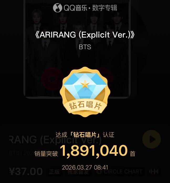 π "Arirang" ΡΡΠ°Π» ΡΠ°ΠΌΡΠΌ Π±ΡΡΡΡΡΠΌ Π°Π»ΡΠ±ΠΎΠΌΠΎΠΌ, ΠΏΠΎΠ»ΡΡΠΈΠ²ΡΠΈΠΌ Π±ΡΠΈΠ»Π»ΠΈΠ°Π½ΡΠΎΠ²ΡΠΉ ΡΠ΅ΡΡΠΈΡΠΈΠΊΠ°Ρ Π½Π° QQ Music, Ρ Π±ΠΎΠ»Π΅Π΅ ΡΠ΅ΠΌ 1,8* ΠΌΠΈΠ»Π»ΠΈΠΎΠ½Π°ΠΌΠΈ ΠΏΡΠΎΠ΄Π°ΠΆ Π·Π° ΠΏΠ΅ΡΠ²ΡΡ