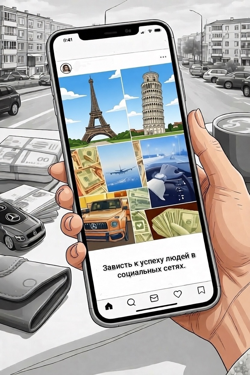 Иногда достаточно нескольких минут в ленте, чтобы почувствовать раздражение, тревогу или ощущение, что «я отстаю». Чужие поездки, проекты, деньги, красивые кадры — и на их фоне собственная жизнь начинает казаться недостаточно интересной, не такой «собранной» или даже бессмысленной. В такие моменты легко потерять контакт с тем, что есть у себя, и начать смотреть на свою жизнь через призму чужих результатов. Это переживание часто называют завистью, но по сути это не просто реакция на чужой успех. Это момент, в котором человек сталкивается со своей реальностью — с тем, где он сейчас находится, и с тем, чего ему не хватает или что пока не реализовано. И напряжение здесь возникает не случайно: сравнение идёт не с реальной жизнью других людей, а с её отобранной, «витринной» частью, в которой нет сомнений, усталости, ошибок и периодов застоя.