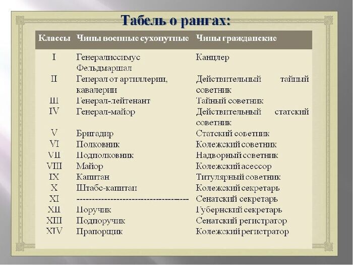 Читаю биографию Гоголя и через раз встречаются все эти "коллежские асессоры" и "титулярные советники". Кто это такие? Это не названия конкретных должностей, а классные чины, которые были основой государственной службы в Российской империи. Чтобы в этом разобраться, нужно понять всего одну вещь - Табель о рангах. В 1722 году Пётр I ввёл "Табель о рангах", указ с таблицей, который разделил всю государственную службу (военную, придворную и гражданскую) на 14 классов. Чин определял место человека в иерархии и давал определённые привилегии. Это как лестница из 14 ступенек, где 1 класс самый высокий, а 14 самый низкий. Получение того или иного чина открывало путь к соответствующим должностям. В середине 19 века как правило министрами становились чины 2, а губернаторами - 4 класса. Причем, гражданские чины и военные звания были приравнены друг к другу. Благодаря этому любой военный видя гражданского, понимал, кто перед ним по рангу. Чин давал реальные привилегии, которые определяли жизнь чело